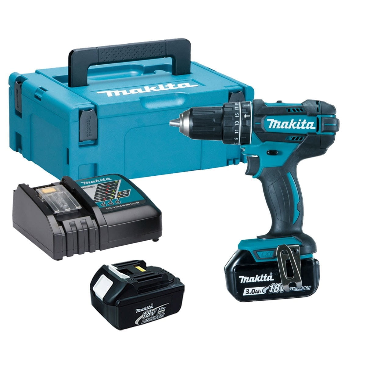 Dostarczana w walizce systemowej MAKPAC z dwoma akumulatorami BL1830B (18 V / 3,0 Ah) i ładowarką
