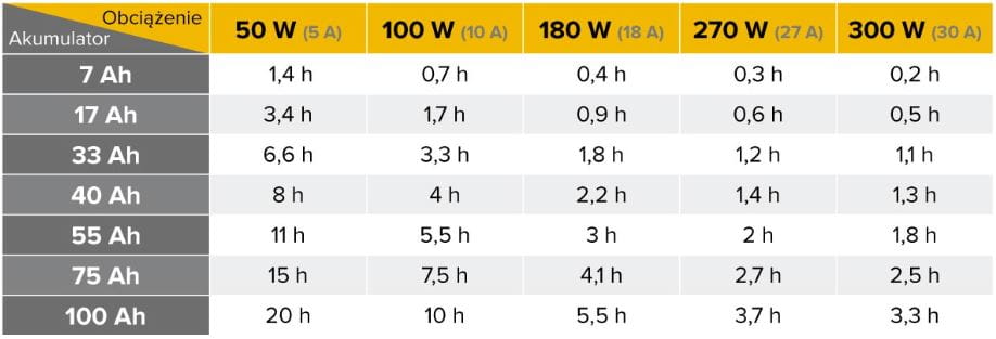 Aby zapewnić najwyższą jakość pracy awaryjnego zasilacza KEMOT należy dobrać do niego odpowiedni akumulator. Doboru optymalnego akumulatora można dokonać korzystając z przybliżonego wzoru: 100 W obciążenia = 10 A poboru z akumulatora.