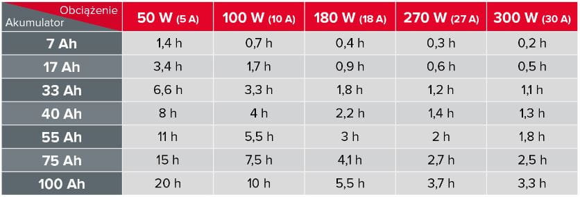 Podstawą właściwego działania awaryjnego zasilacza Rebel jest prawidłowo dobrany akumulator. Aby dobrać odpowiednie urządzenie, należy skorzystać z przybliżonego wzoru: 100 W obciążenia = 10 A poboru z akumulatora.